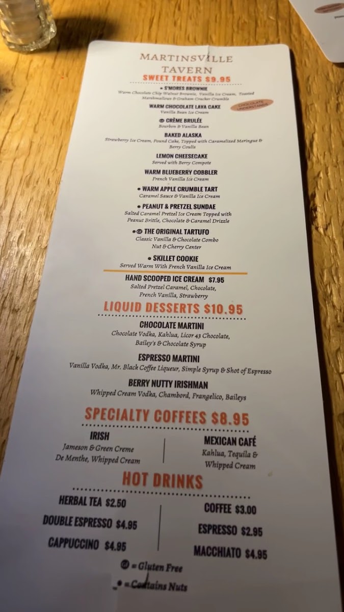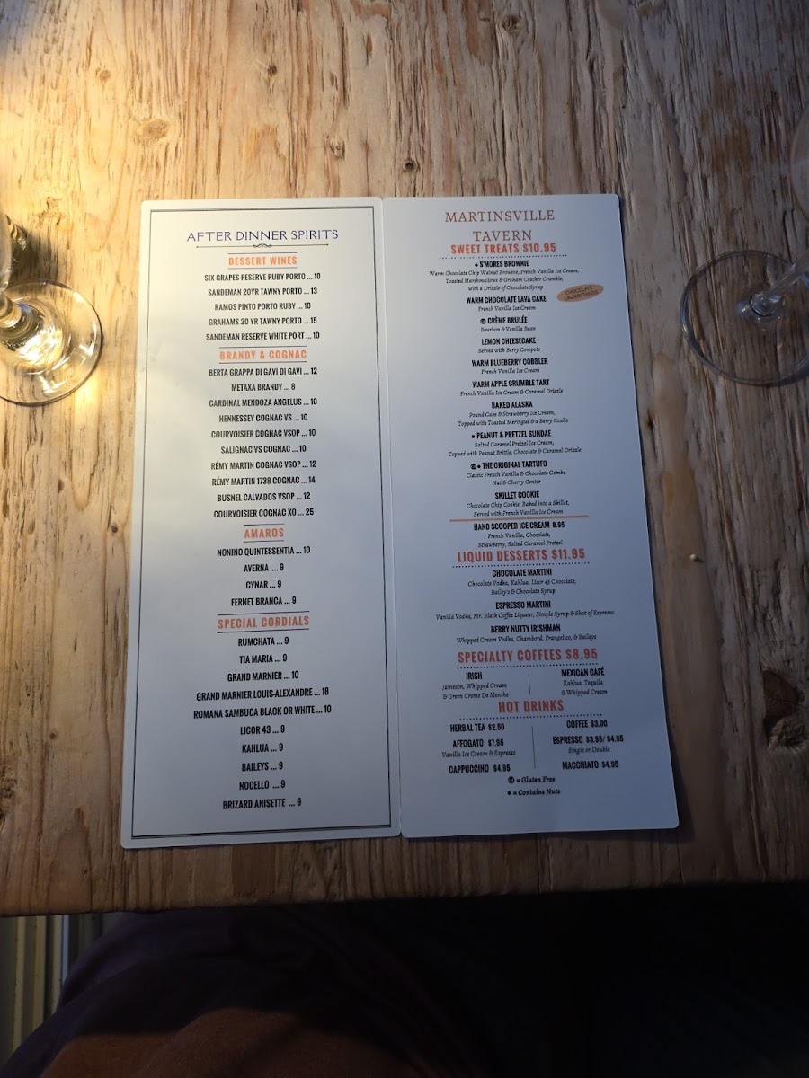 Comfortable enough for a laid-back lunch and satisfying enough for date night or special events, the food and drink at Martinsville Tavern fit seamlessly into its rustic yet refined setting. Each dish and drink feels like a thoughtful moment to savor, encouraging guests to relax and enjoy their time. Sweet endings, including warm chocolate lava cake or Belgian dark chocolate torte, provide a sweet close that rounds out the overall experience with a gentle touch.
